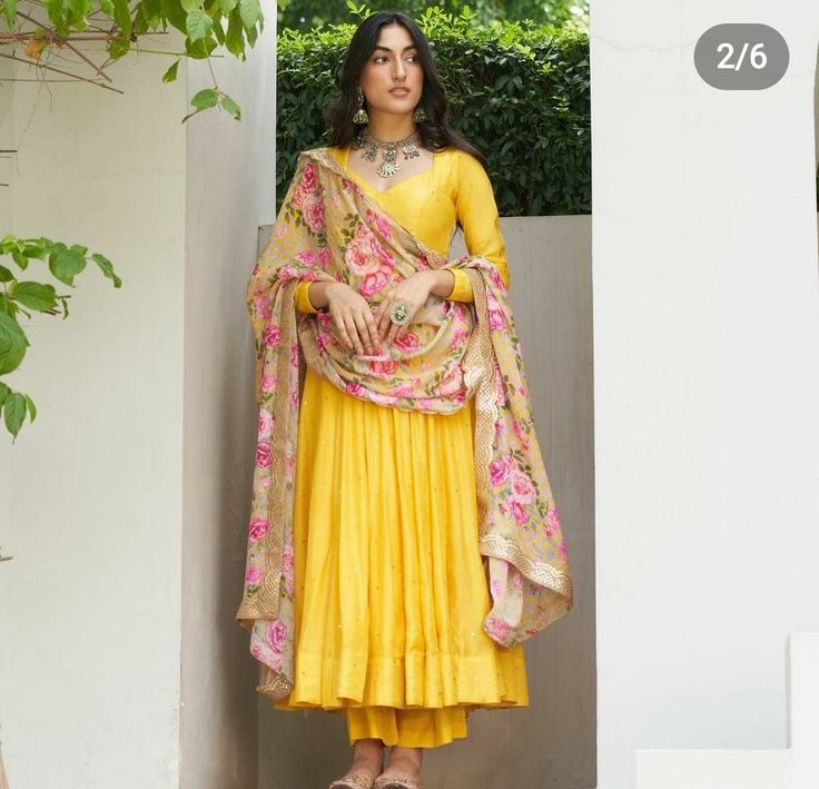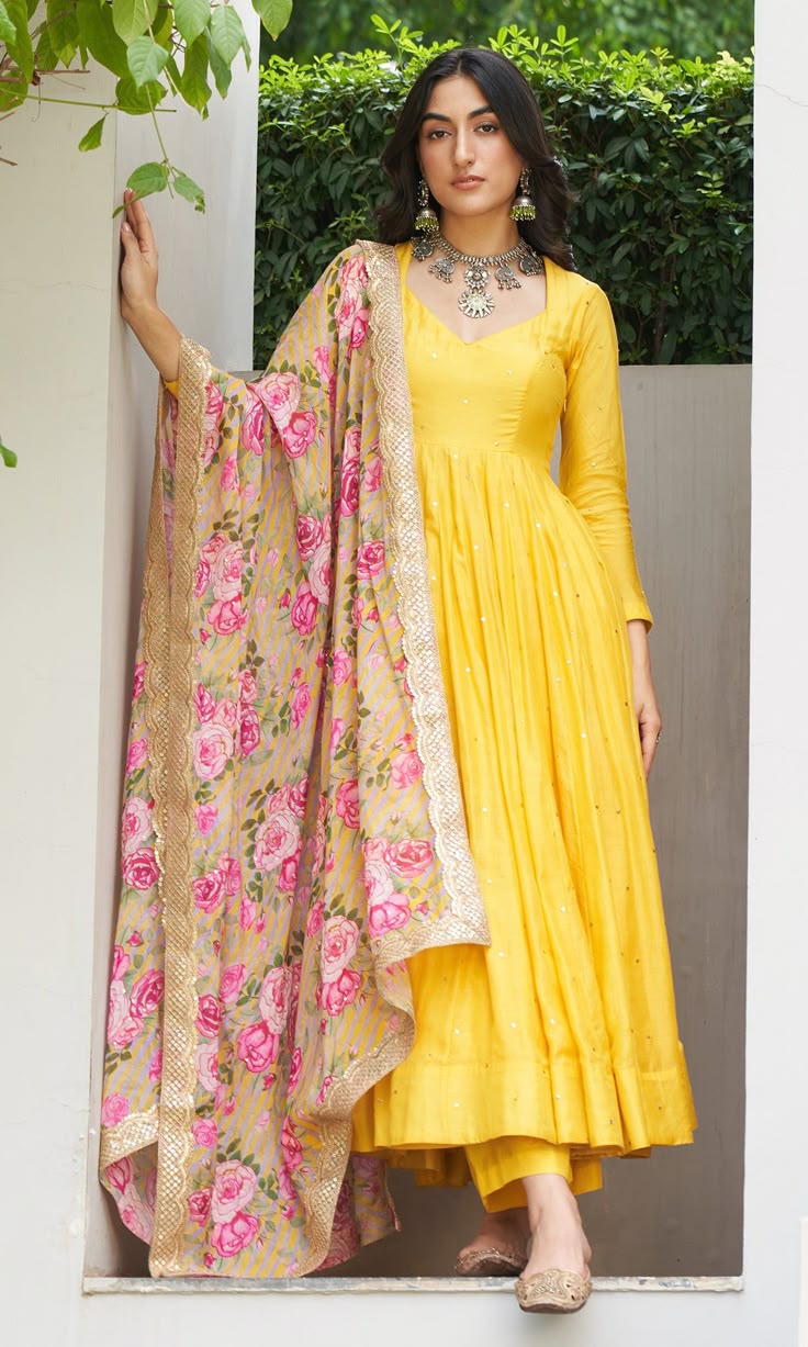 Brighten up your wardrobe with this elegant yellow Anarkali suit, paired with a charming pink floral dupatta. Lightweight and comfortable, it’s perfect for festive occasions or casual celebrations, combining style and grace effortlessly.