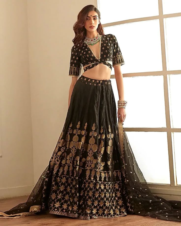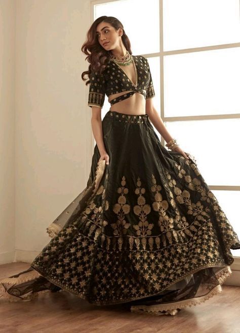 Shine at every occasion with this stunning black lehenga adorned with golden accents. Its graceful silhouette and intricate detailing make it perfect for weddings, festive celebrations, and special events.